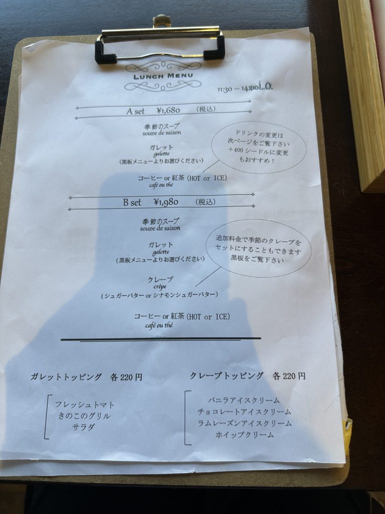 季節のスープに、蕎麦粉ガレット、クレープがつき、飲み物がつくコースか