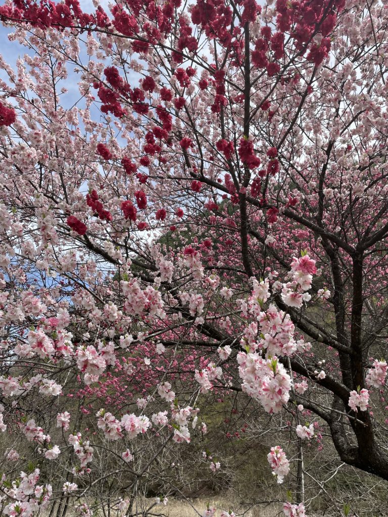 白やピンクの花桃に心を奪われます。